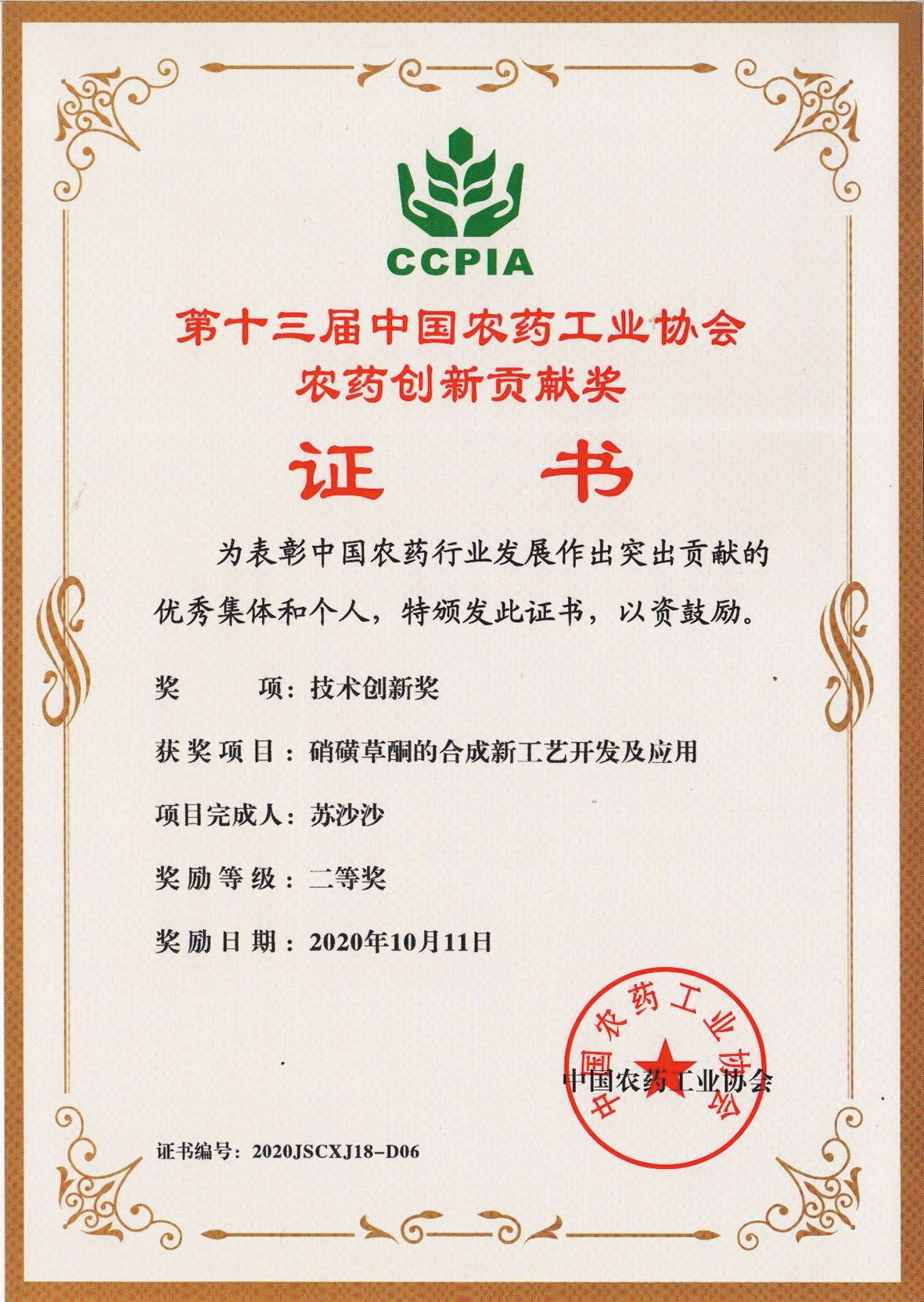■2020-11-05 我公司“硝磺草酮的合成新工藝開發及應用”項目榮獲技術創新獎