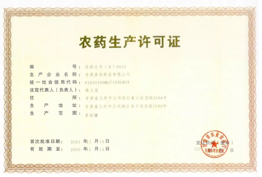 最終,甘肅濱農(nóng)順利通過草銨膦原藥農(nóng)藥生產(chǎn)許可審查并取得農(nóng)藥生產(chǎn)許可證(證號為農(nóng)藥生許(甘)0013),進一步夯實了公司生產(chǎn)基礎(chǔ),為濱農(nóng)戰(zhàn)略發(fā)展再添強勁動力。