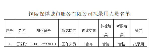 根據(jù)《銅陵保祥城市服務(wù)有限公司招聘公告》規(guī)定,經(jīng)過報名、面試、體檢、考察等環(huán)節(jié),現(xiàn)將擬錄用人員公示如下(見附件)。