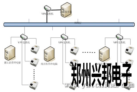 如上圖所示,把整個(gè)系統(tǒng)的管理電腦納入到VPN局域網(wǎng)絡(luò)中來,使各家分店和總部服務(wù)器之間的通訊無地理的局限,實(shí)現(xiàn)整個(gè)系統(tǒng)數(shù)據(jù)的實(shí)時(shí)交換。