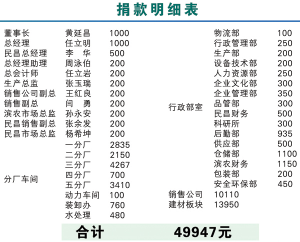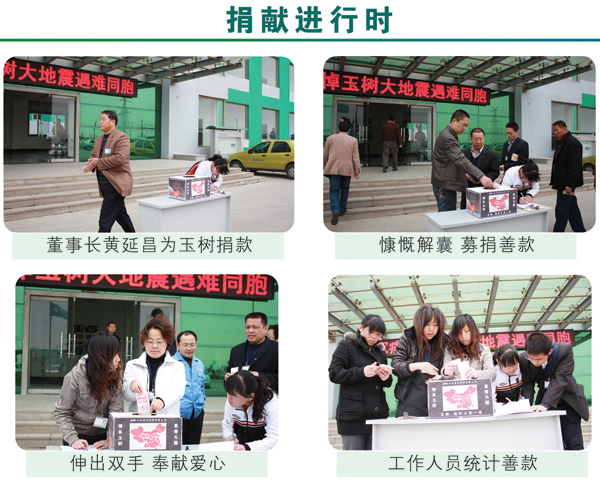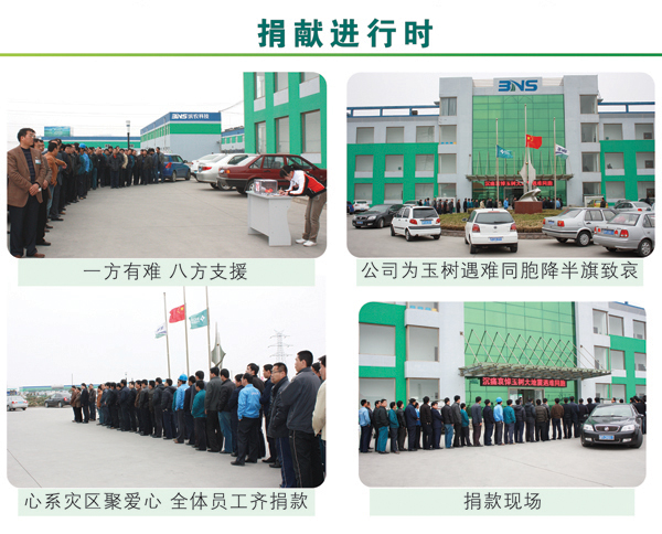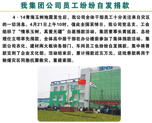 4·14青海玉樹地震發(fā)生后,我公司全體干部員工十分關(guān)注來自災(zāi)區(qū)的一切消息。2010年4月21日上午10時(shí),值此全國哀悼日,我公司黨總支、工會(huì)組織了“情系玉樹,真愛無疆”自愿捐款活動(dòng),集團(tuán)董事長黃延昌、總經(jīng)理任立明率先捐款,全體高中層干部在辦公樓前參加了集體捐款活動(dòng)。集團(tuán)公司農(nóng)化、建材兩大板塊各部門、車間員工也紛紛自發(fā)捐款,集中將善款交到了企業(yè)文化部。活動(dòng)結(jié)束后,累計(jì)捐款近五萬元,這批善款將用于馳援災(zāi)區(qū)同胞抗震救災(zāi),重建家園。